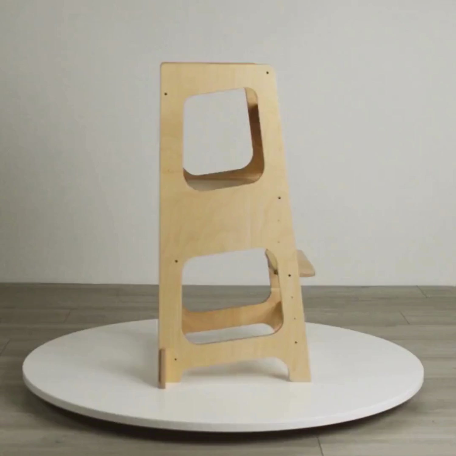 Die meisten Lerntürme haben keine aktive Sicherung vor dem Umkippen. Dieser schon – und zwar doppelt. Eingebaute Stabilisatoren an der Basis verhindern, dass der Turm zur Seite kippt. Die abnehmbare Rückwand schließt die Öffnung nach hinten und gibt deinem Kind obendrein zusätzlichen Halt. Beides ist standardgemäß enthalten – kein Zubehör, kein Aufpreis. Damit du entspannt neben deinem Kind stehen kannst, ohne ständig nachgreifen zu müssen.